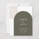 This save the date coordinates seamlessly with our matching green arched boho wedding invitation suite, allowing you to build a cohesive stationery collection. The earthy colour palette of muted evergreen and warm neutral works beautifully for spring and fall weddings alike. Announcement card. Script calligraphy font. The couple's names are written in capital letters and at the bottom in small letters is "invitation to follow".
