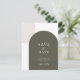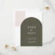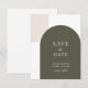 Set the tone for your wedding with this minimalist save the date card, featuring two arches. A basic sage green arch and a simple beige rustic arch in the corner. The clean, retro layout offers a modern take on elegant bohemian style, making it ideal for couples planning an outdoor celebration, courtyard wedding, or intimate gathering.