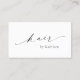 Modern business cards featuring a simple and minimal black and white design with "hair" in an elegant calligraphy along with your name on the front. The back has your contact info along with social media icons and an optional QR Code in a minimalist layout. The QR Code may be removed and the social media icons may be changed or removed in the design editing tool.