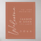 Minimal Terracotta Script Wedding Welcome Sign. Stylishly impress your wedding guests with this trendy terracotta wedding welcome sign featuring a beautiful white script on a striking burnt orange background. This wedding welcome sign has a stunning terracotta and white design, with modern and minimal vibes, perfect for your simple, trendy, minimalist wedding. The minimal and stylish layout brings attention to the white script, contrasting with the burnt orange background. This wedding welcome sign will set the tone for a beautiful wedding setting surrounded by either white or terracotta florals, and matching neutral wedding decor. A perfect addition to any muted or beautiful burnt orange wedding celebration. The Sunday Collective © by Rachel Hannah Gee