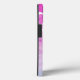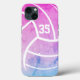 This cute girls' volleyball iPhone case features a minimalist volleyball (represented only by the ball's seams in white) overlying a pink to blue distressed look gradient background - personalize with her jersey number - by katz_d_zynes