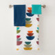 Ce kit de serviettes est doté d'un linge turquoise, d'une serviette bleue à la main et d'une serviette de bain au design moderne du milieu du siècle de demi-cercles empilés en trois couleurs rétro sur un champ de blanc. Voulez-vous le même design avec des couleurs différentes? Message-moi.