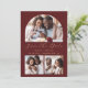 This simple, minimalist Save the Date card features a 3-photo collage, with an arch-shaped photo at the top and two smaller square photos at the bottom. In between, the words "Save the Date" appear in elegant gold-coloured handwriting script, followed by the couple's names, wedding date and city in sans serif font on a burgundy red background. Add a more detailed message with additional information on the reverse, along with a QR code to help your guests visit your wedding website.
