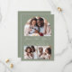 This simple, minimalist Save the Date card features a 3-photo collage, with an arch-shaped photo at the top and two smaller square photos at the bottom. In between, the words "Save the Date" appear in elegant white handwriting script, followed by the couple's names, wedding date and city in sans serif font on a sage green background. Add a more detailed message with additional information on the reverse, along with a QR code to help your guests visit your wedding website.