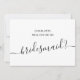 A minimalist bridesmaid proposal card featuring simple and elegant script on black and white would typically have a sleek and stylish look. The use of a black and white colour palette creates a bold contrast and provides a modern and sophisticated feel. The script font would be clean and refined, adding a touch of elegance to the design. The minimalist layout would keep the focus on the wording, making it clear and easy to read. The use of negative space would create a sense of balance and simplicity, giving the card a minimalist and timeless look.