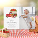 This minimalist first birthday invitation has a watercolor fire red farm truck overfilled with strawberries and basket in front. It also has a photo template area. The text can be modified to celebrate any birthday year.