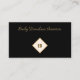 A simple, elegant, minimalist business card for an interior designer features gold text on a black background, with a diamond shaped badge and monogram. The back is gold, with black text. Could work for a variety of businesses, including finance, beauty, style, computers, etc.