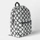 The backpack features a minimalist black and white design. The pattern consists of interlocking geometric shapes that resemble a chain or net. The overall effect is sleek, modern, and sophisticated.