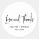 Modern wedding favour stickers featuring a simple design with "Love and Thanks" in an elegant script typography and your names and wedding date in a minimalist sans serif font. All design elements are in black and white. These chic favour stickers add a nice touch to favours for any style of wedding.