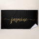 Girly Feminine Minimalist Simple Clean Black And Gold Monogram Name Signature Script Custom Personalized Summer Beach Towel. This design featuring your first name in a pretty hand lettered style swash tail font signature typography (or calligraphy) on black and gold background. These are easy to customize it. Great stylish feminine housewarming gift, also for birthday, mother’s day, wedding, sweet 16 birthday party, bachelorette party, bridal shower, for graduation party and It’s for the girl who likes simple clean things.