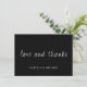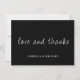 Customizable wedding Thank you card. Featuring Love and Thanks in script in white font on a black background. With a customizable message on the reverse.