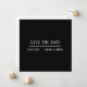 Minimalist Save the Date with a dramatic flair. Flat square card with black background and white text. Simply elegant with room for custom QR code on back.