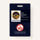 A blue grunge design covers the face of the card. Northwards at the left wall, is a photo template option for a photo size of 1,000 x 1,200 pix. Beside the photo lies your prestigious name, job title and employee number. This is followed by an optional red healthcare logo, the organization's name and email contact near the base.