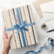 The wrapping paper features a simple, yet elegant design with a combination of bohemian and minimalist elements. The colours are mostly earthy tones, such as muted browns and greens, with accents of navy and rusty red. The ethnic pattern adds a touch of cultural influence to the overall design. The paper itself appears to be a natural brown colour, further adding to the earthy feel.