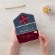 Romantic, minimalist, simple, modern, contemporary navy blue and burgundy all-in-one wedding invitation with QR code, monogram with hand drawn love couple birds, trendy handwritten script and custom picture of the at the back.