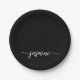 Modern Minimalist Elegant Black Feminine Monogram Name Script Signature Custom Personalized Paper Plates. This design featuring your first name in a pretty hand lettered style swash tail font signature typography (or calligraphy) white script on black colour background. These are easy to customize it. Great for housewarming, also for birthday, wedding, sweet 16 birthday party, bachelorette party, for graduation party, bridal shower, baby shower and It’s for the girl who loves unique minimalist things.