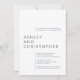 Elegantly simple minimalist wedding invitation featuring clean typography and a bold modern composition. Design features wedding details aligned against shifted margins, highlighting the couple's names as an isolated text block. Design is stripped of extraneous ornamentation thereby prioritizing functionality, balance and harmony. Perfect for couples that embrace utmost simplicity, elegance and style. Back of card is left blank, with a solid colour background. Design is available in a curated selection of modern colours and is easily personalized. Please share a comment and reach out for assistance in personalization or for any customizations. We look forward to hearing from and working with you!