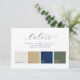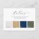 This classic card features four swatches for the colour scheme of your wedding. You can edit the colour of each in the Zazzle editor. Elegant dark blue lettering in serif and script fonts lay out the title, instructions, and labels for the name of each colour. ⚠ If you want to edit the calligraphy & use special characters, copy and paste them from this page: bit.ly/Emeline-Script ⚠••• For more wedding suites, visit my store Zazzle.com/EventsByJessicaAmber ••• For custom orders, message me on Zazzle