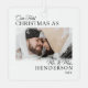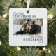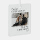 Simple chic newlywed christmas ornament featuring a modern white background, a photo either side, the saying 'our first christmas as mr & mrs', your name, and the year.