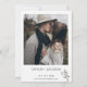 Simple, modern and minimalist in style, terracotta colored wedding invitation with a modern italic calligraphy word between the couples names and a single flower motif on the back and front. The back of the invitation also features a photograph of the couple and a few more details.