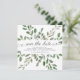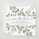 This trendy wedding save the date card features a frame of abundant watercolor green leaves and a few tiny berries on a clean white background. The back of the invitation also says "Save the Date" in elegant calligraphy. Perfect for your upcoming elegant, minimalist wedding.