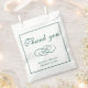 Express your gratitude with these charming wedding favour bags, perfect for leaving a lasting impression on your guests. These white bags feature emerald green text that says "Thank You," offering a vibrant and heartfelt touch. You can further personalize them with the couple's names and wedding date, making each bag a unique keepsake. Ideal for holding small treats or mementos, these favour bags blend seamlessly with your wedding decor, adding a cohesive and thoughtful element to your special day.