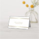A modern elegant white and gold wedding place card featuring the bride and groom's names on the back along with their wedding date.