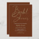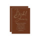 This invitation effortlessly combines simplicity and grace, focusing on the captivating interplay of metallic tones against the rich, warm backdrop of cinnamon brown. The centerpiece of the design is the "Bridal Shower" script, exquisitely rendered in shimmering gold. The gold script adds a touch of opulence and sets the tone for a celebration of love and refinement. Surrounding details, elegantly scripted in both gold and silver, further enhance the invitation's luxurious appeal.