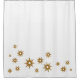 Modern shower curtain features a simple gold starburst pattern on a white background. Each starburst features a light golden star overlapping with a larger sparkly copper starburst. A simple, clean mininmalist design,