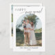 This Holiday Card features an arched photo on the front and 3 photos on the back. For this design "Happy new year" is not editable, but all other text can be customized.