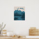 A vintage style poster with a minimalist landscape illustration of a lake with trees and mountains in blue tones on a beige background: perfect wall art for office or home decoration.