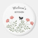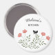 3 inch round magnet with minimalist pink flower and butterfly design on white background.