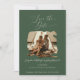 Simple, minimalist design in forest green and soft taupe. Featuring a watercolor brush stroke shaped framed opening to customize your engagement photo. A calligraphy handwriting script font with flourishes is used for the "Save the Date," title. Art graphically designed by internationally licensed artist and designer, Audrey Jeanne Roberts, copyright.