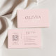 Elevate your brand with this luxurious and feminine design, featuring a beautiful blush-pink background and sophisticated deep-pink text on both sides. The front presents a clean layout with your name in a striking modern font, overlaid by a delicate, sweeping signature script. The back maximizes utility by neatly organizing contact details, social media icons, and a custom QR code, delivering a refined and highly functional first impression.