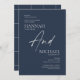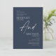These 5" x 7" formal wedding invitations feature a minimalist style design with light grey lettering on a navy blue background with the following placeholders, honorific, parent name, introduction, wedding couple first and last names, day of the week, date, time, venue, venue address and reception.