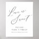 Modern script minimalist wedding love is sweet take a treat sign in charcoal black and white, simple and elegant.
