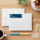 Bold white monogram initials with left aligned return address on a navy blue colour block frame.