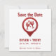 Modern, minimalist Save the Date announcement features red glitter party location icon with customizable text on white background. Available in print and digital format .