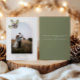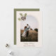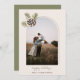 Minimalist Pine Cone & Leaves Double Arch Photo Holiday Card with back message on a green background.