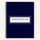 Modern notebook features a minimal design in navy blue. Custom name and title, role or subject presented in a black and white frame.