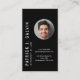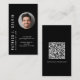 Minimalist professional black business card featuring your photo in a circle frame, your name and title in modern white typography on the side, and your contact information (such as email, telephone numbers, firm name and mailing address) in clean, simple white typography. On the back, input a URL address to create a scannable QR code linked to your website, social media profiles, or any other platform that showcases your work, and customize additional text or leave blank.