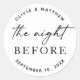 Add a modern, romantic detail to your wedding rehearsal dinner with this elegant black and white round sticker featuring the phrase “The Night Before” in a stylish script font. Set against a clean white background, this minimalist design is ideal for casual, boho, or modern wedding themes. Use as a favour tag, envelope seal, or welcome bag sticker to add a personalized touch to your pre-wedding celebration.
