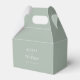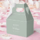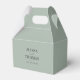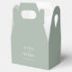 Modern wedding favour boxes with minimalist typography design in sage green colour.