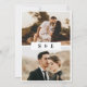 This modern and elegant wedding invitation beautifully blends classic sophistication with a fresh contemporary touch. The front features a full, warm-toned photograph of the couple, creating an intimate and personal centerpiece. Elegant calligraphy highlights the couple’s names and key wedding details, while a clean sans-serif font balances the layout for a minimalist, refined look. The black-and-white colour palette enhances the timeless appeal, letting the photo and typography shine. The back design includes two photos at the top and bottom with a monogram or initials showcased in the centre, creating a cohesive, stylish, and meaningful design that couples will cherish. Perfect for formal, chic, and modern weddings.