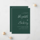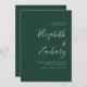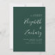This simple modern wedding save the date card features white text in stylish handwriting calligraphy and sans serif font, aligned with the right margin on an emerald green background. The back of the card is solid emerald green.
