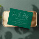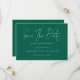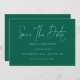 Minimalist Script Emerald Save The Date. Available digitally and printed. Simple elegance with Save The Date in a modern set script.The rest of the text you can easily personalise. Shown here in white and emerald green however the text and background colours can be changed if you wish via the customise further option.