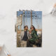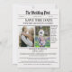 Minimalist calligraphy newspaper wedding save the date with three photos, one of the groom and bride as children and one of them as adults.
