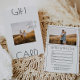 Our sleek and modern gift certificate card features a minimalist design, stylish script typography and 2 photos. Add your contact details, like website, social media handle and email. Photos by prostooleh / Freepik.