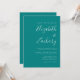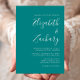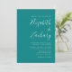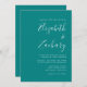 This simple modern wedding invitation features white text on a teal blue background. Add the names of the bride and groom in stylish handwriting calligraphy and the details in sans serif font. The reverse side is a matching shade of solid teal.