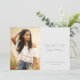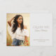 This minimalist graduation announcement features simple typography and a light grey and gold colour palette. On the front, a vertical photo is displayed on the left side. To the right, "Graduate" is written in modern all caps typography, with the grad's name written in calligraphy below. At the bottom, add the graduate's school and graduation year. On the back, there is a template for graduation party details. The typography is written in gold against a light grey background on both the front and the back.